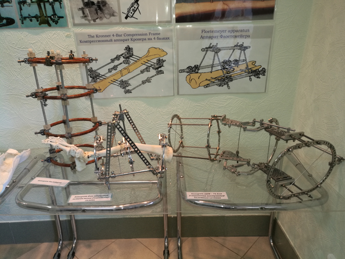 在Ilizarov中心,还有一个必须要去的地方——博物馆。馆前有Ilizarov专用车,是和感染科相连的一幢楼。走进博物馆首先映入眼帘的是外固定在全身骨骼应用的支架标本,还有用配件做成的艺术品,有教授以前的手术室和手术器械,其中手摇钻的设计非常特别,零距离的感受到了大师丰富的想象和发明能力。